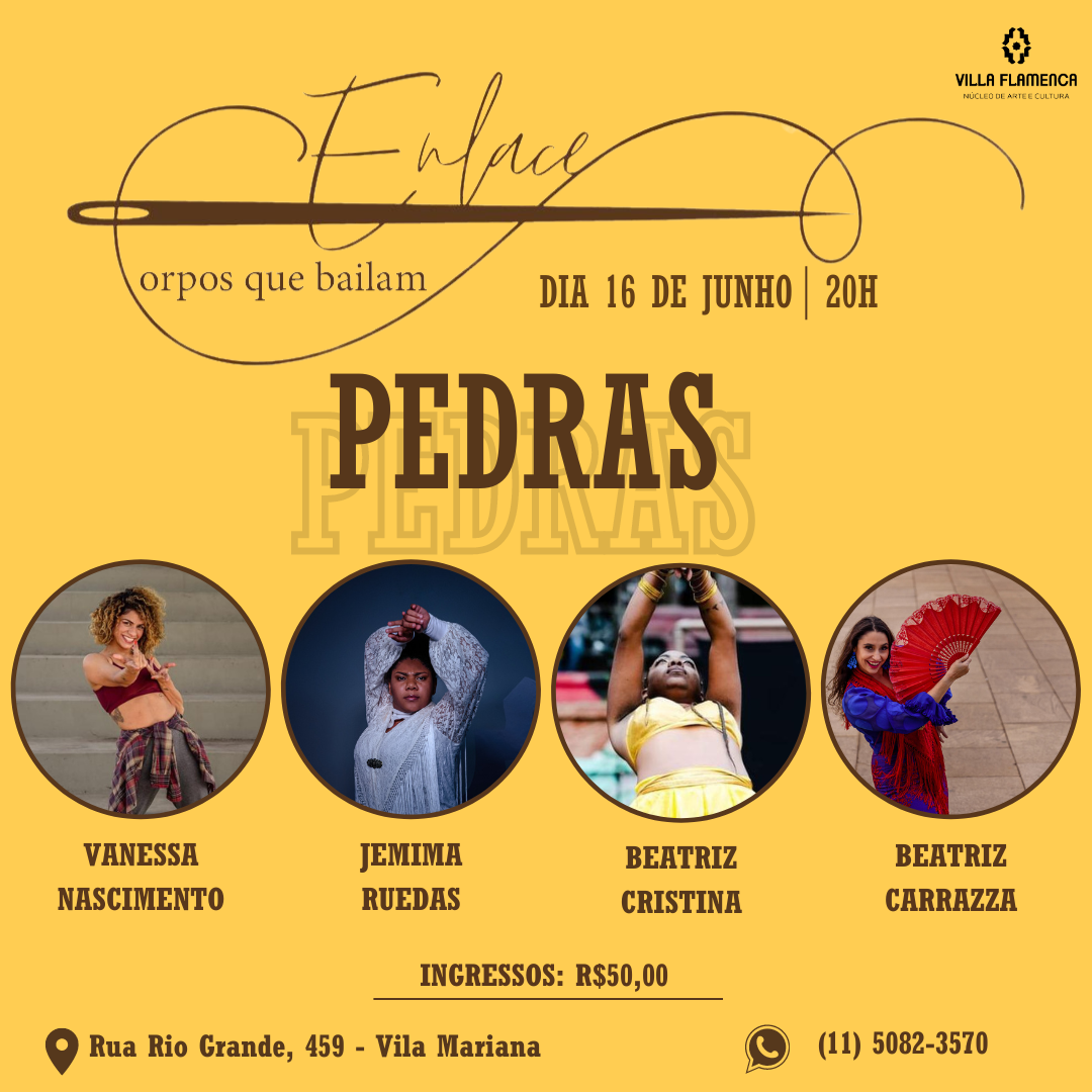 É com imenso prazer que convidamos vocês para a segunda edição do nosso Enlaces, corpos que bailam! Um show de dança intimista no qual bailarinas de diversas modalidades se entrelaçam regidas por um só tema! Nessa noite 16/6 com contemporâneo , Dança Afro e Flamenco elas bailarão o tema “Pedras”
