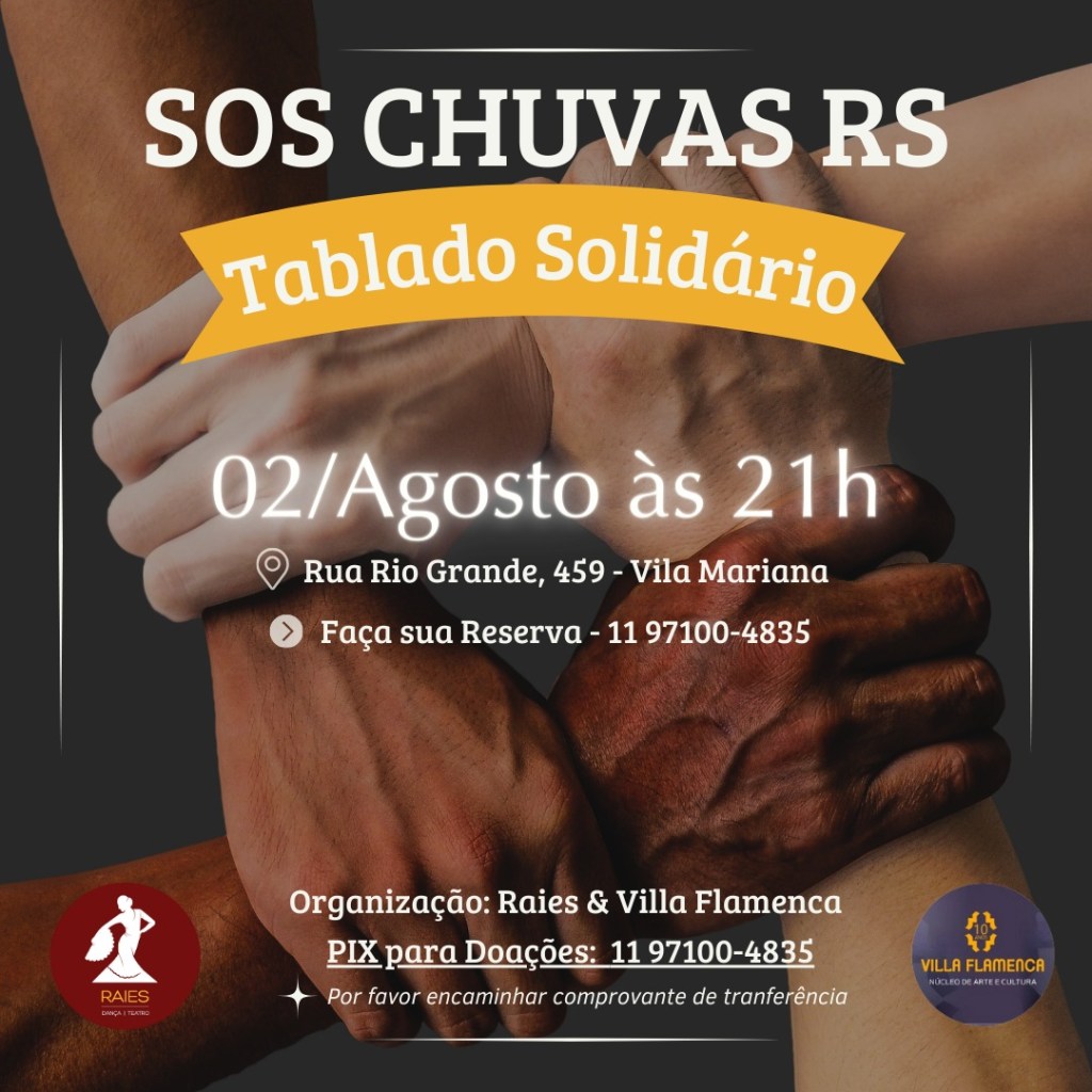 A Villa Flamenca e o Raies Dança Teatro se juntam a artistas Flamencos maravilhosos, para criarem o segundo evento solidário em prol das vítimas das enchentes no Rio Grande do Sul .